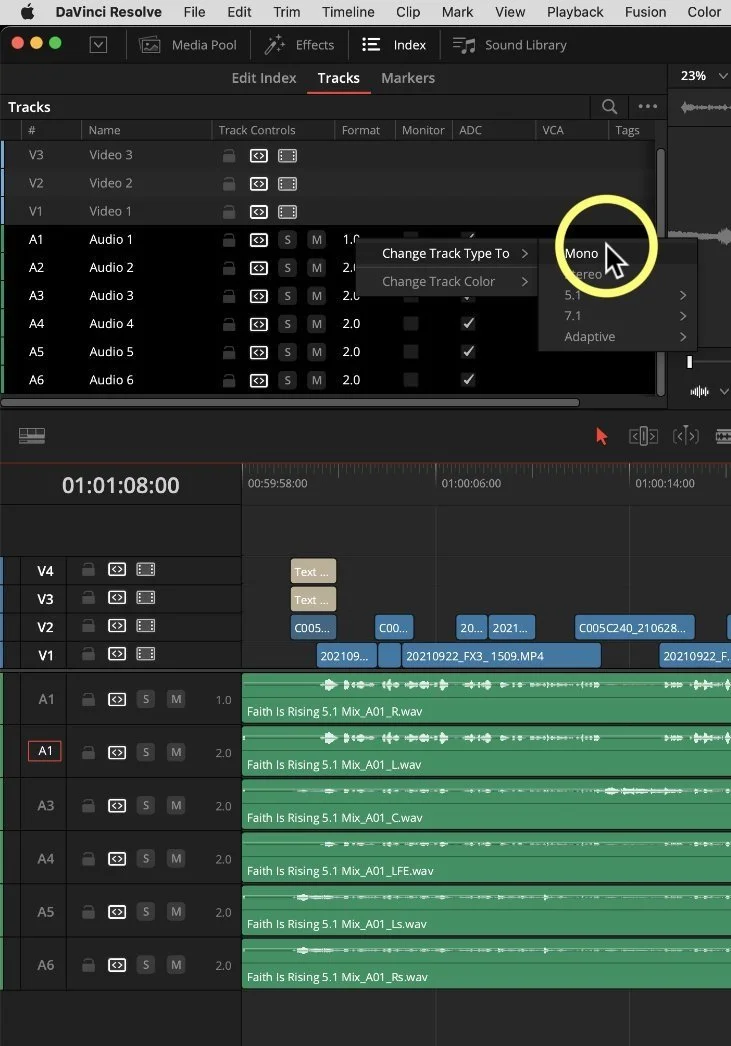 And for me, place on top likes to create stereo tracks. So if I’m dropping voice-over or a 5.1 mix down, which is something I do a lot - they are incorrectly assigned stereo. To change this, you would right-click on the tiny 2.0 area and change the track type to mono. You have to do this one at a time. No fun!